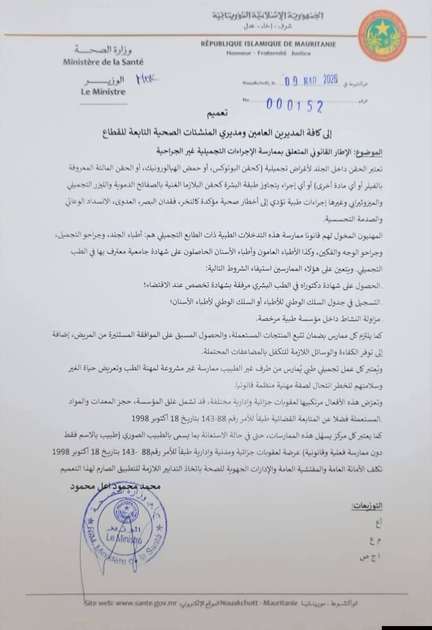 وشدد التعميم على ضرورة توفر عدد من الشروط لمزاولة هذه الأنشطة، من بينها الحصول على شهادة دكتوراه في الطب، والتسجيل في السلك الوطني للأطباء أو أطباء الأسنان، وممارسة النشاط داخل مؤسسة صحية مرخصة، مع ضمان تتبع المنتجات المستعملة والحصول على موافقة المريض المسبقة، إضافة إلى توفر الوسائل اللازمة للتعامل مع المضاعفات المحتملة