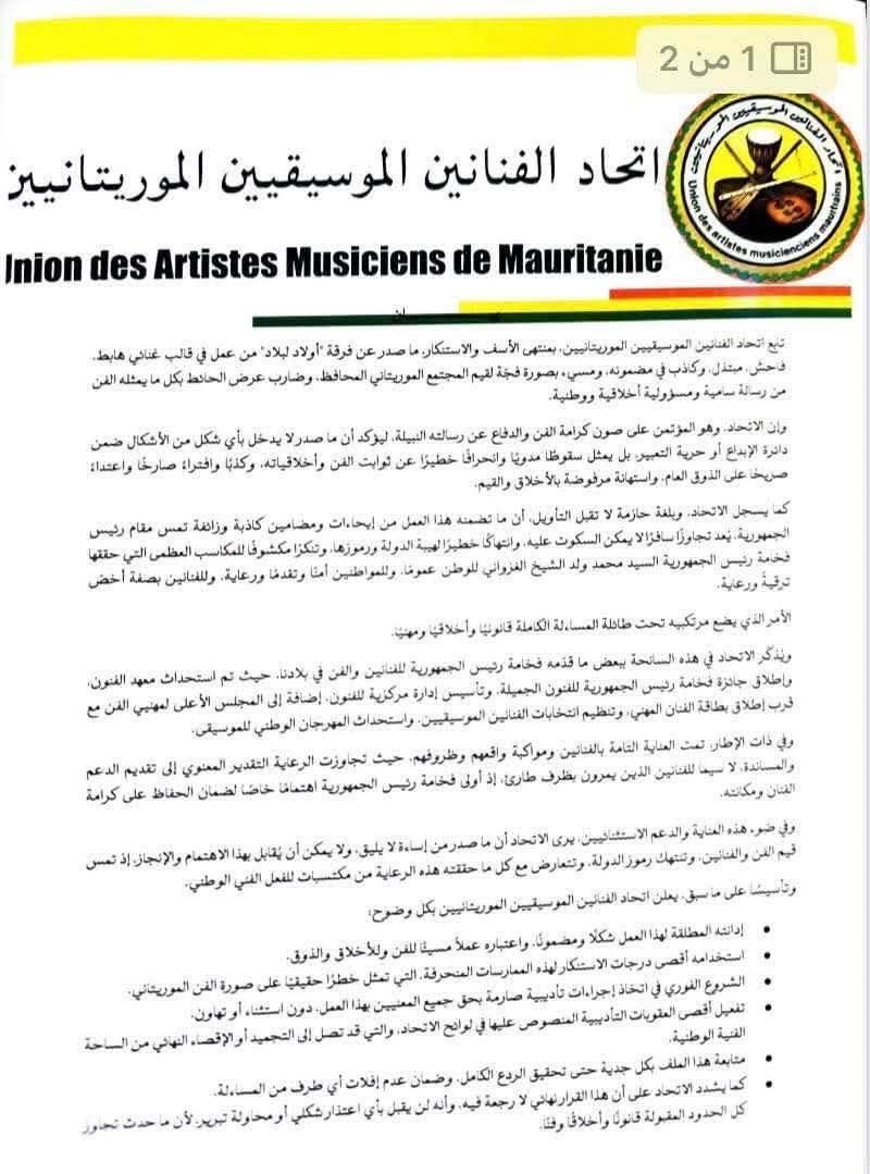 أعرب اتحاد الفنانين الموسيقيين الموريتانيين عن استنكاره الشديد لما وصفه بعمل فني صادر عن فرقة الراب المعروفة بأولاد لبلاد ، واعتبره متضمنًا إساءة واضحة وخروجًا عن القيم الفنية والأخلاقية للمجتمع الموريتاني