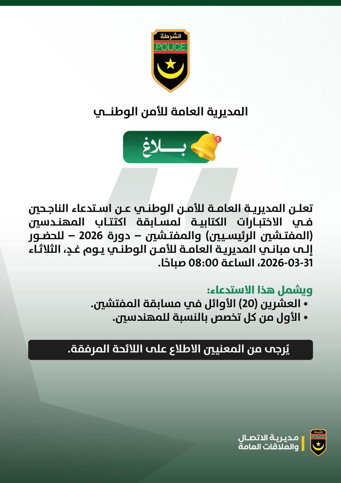 أعلنت المديرية العامة للأمن الوطني عن استدعاء الناجحين في الاختبارات الكتابية لمسابقة اكتتاب المهندسين (المفتشين الرئيسيين) والمفتشين، دورة 2026، وذلك للحضور إلى مباني المديرية العامة يوم الثلاثاء 31 مارس 2026، عند الساعة الثامنة صباحًا. وأوضحت المديرية أن هذا الاستدعاء يشمل العشرين الأوائل في مسابقة المفتشين، إضافة إلى المتصدرين من كل تخصص بالنسبة للمهندسين