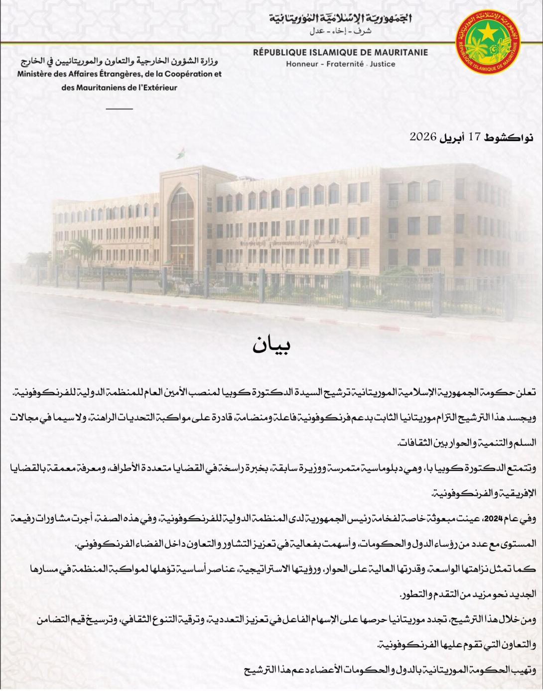 وأوضح البيان أن هذا الترشيح يعكس التزام موريتانيا بدعم منظمة الفرنكوفونية وتعزيز دورها في مواجهة التحديات الراهنة، خاصة في مجالات السلم والتنمية والحوار بين الثقافات.