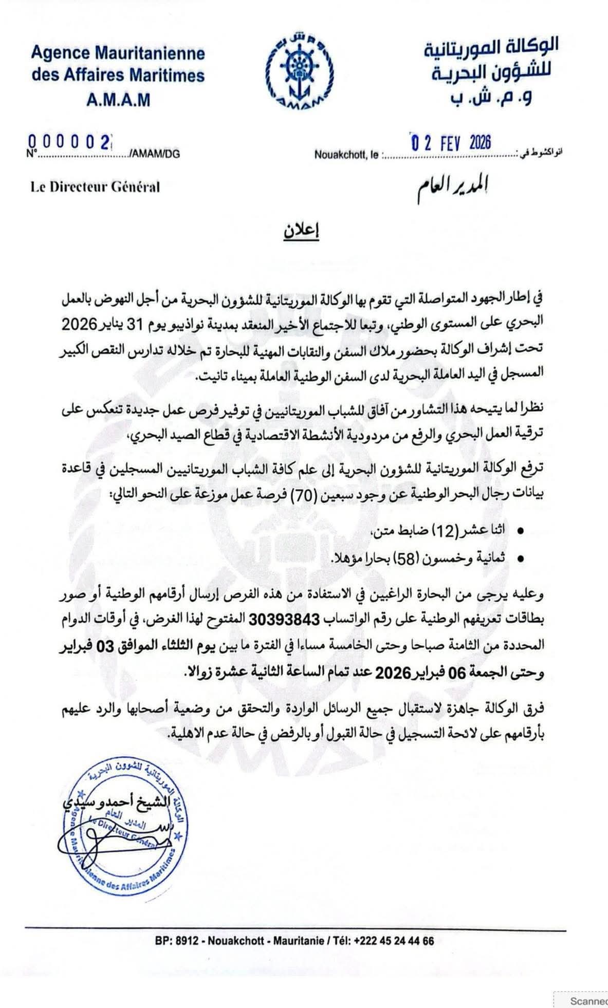 الإعلان عن 70 فرصة عمل للبحارة الموريتانيين