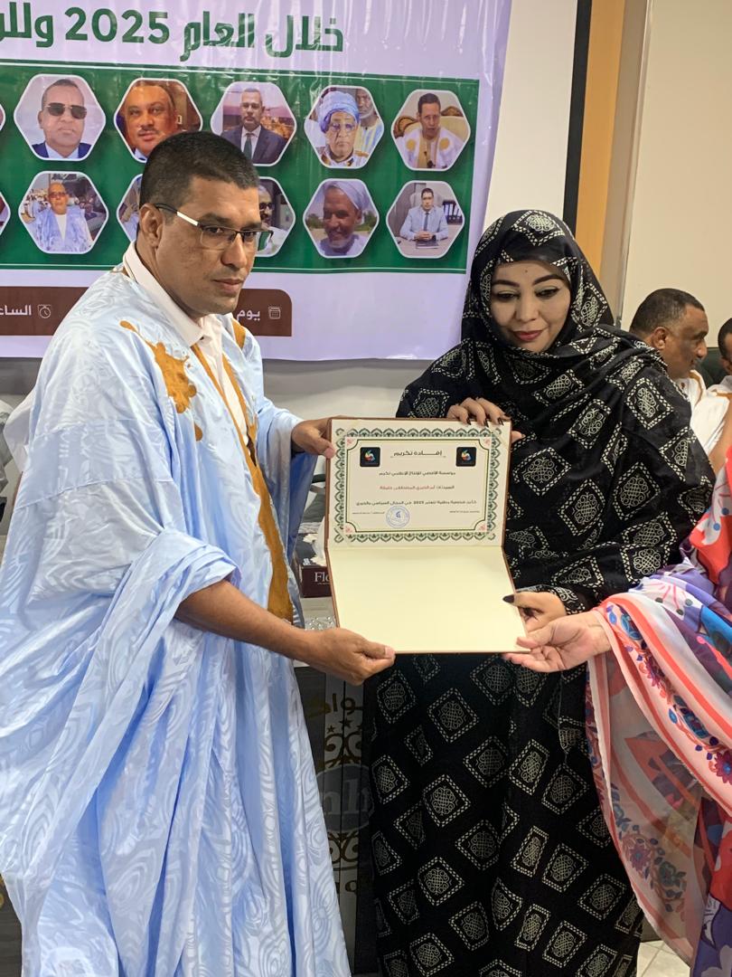 وأشادت المؤسسة بدورها في تشكيل كتلة سياسية داعمة لبرنامج فخامة رئيس الجمهورية السيد محمد ولد الشيخ الغزواني، إضافة إلى جهودها الميدانية والخدمية التي تجاوزت ساكنة أوكار لتشمل خدمة الوطن بأكمله، ما جعلها من أبرز الوجوه النسائية المؤثرة لعام 2025.