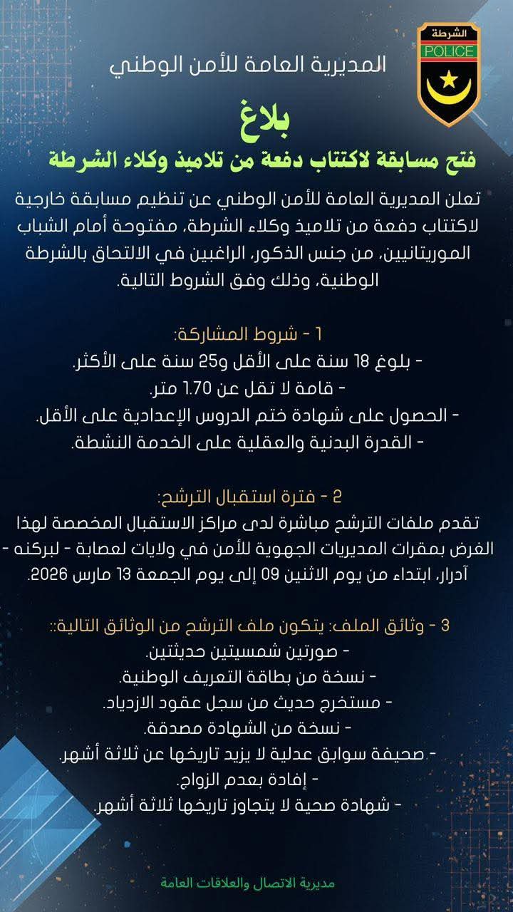أعلنت المديرية العامة للأمن الوطني عن فتح مسابقة خارجية لاكتتاب دفعة جديدة من تلاميذ وكلاء الشرطة، موجهة للشباب الموريتانيين من الذكور الراغبين في الالتحاق بسلك الشرطة الوطنية، وذلك وفق شروط ومعايير محددة.