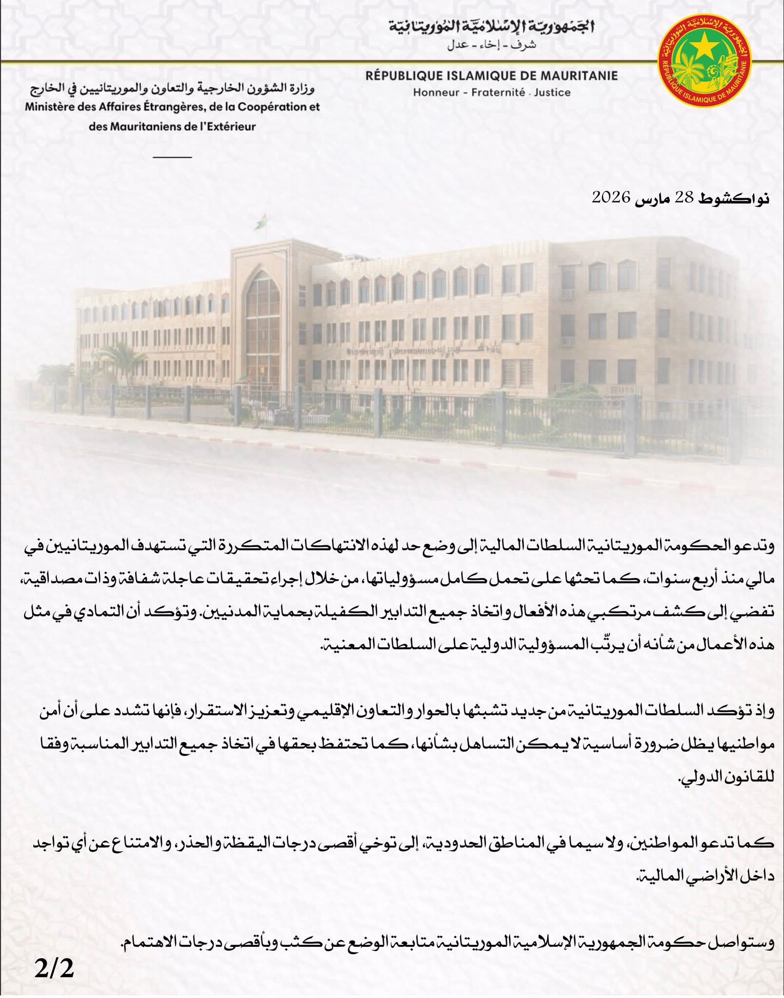 ودعت وزارة الخارجية السلطات المالية إلى وقف الانتهاكات المتكررة بحق الموريتانيين، وفتح تحقيق عاجل وشفاف لكشف المسؤولين ومحاسبتهم، مع اتخاذ إجراءات كفيلة بحماية المدنيين.