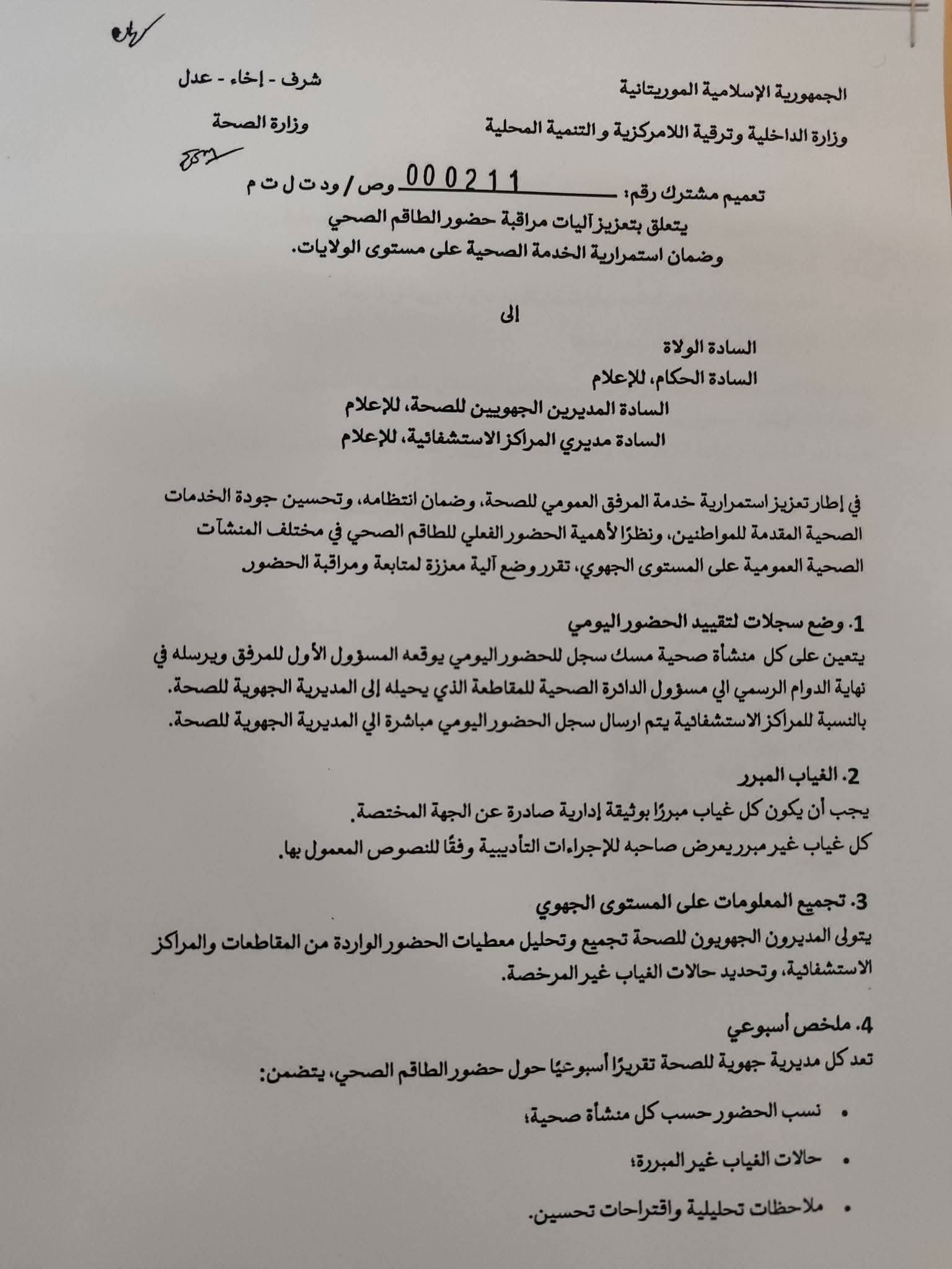 ويهدف التعميم إلى ضبط انتظام عمل المرافق الصحية العمومية، من خلال اعتماد إجراءات عملية لمتابعة الحضور اليومي للعاملين في القطاع، والحد من ظاهرة الغياب غير المبرر التي تؤثر سلبًا على أداء المنظومة الصحية
