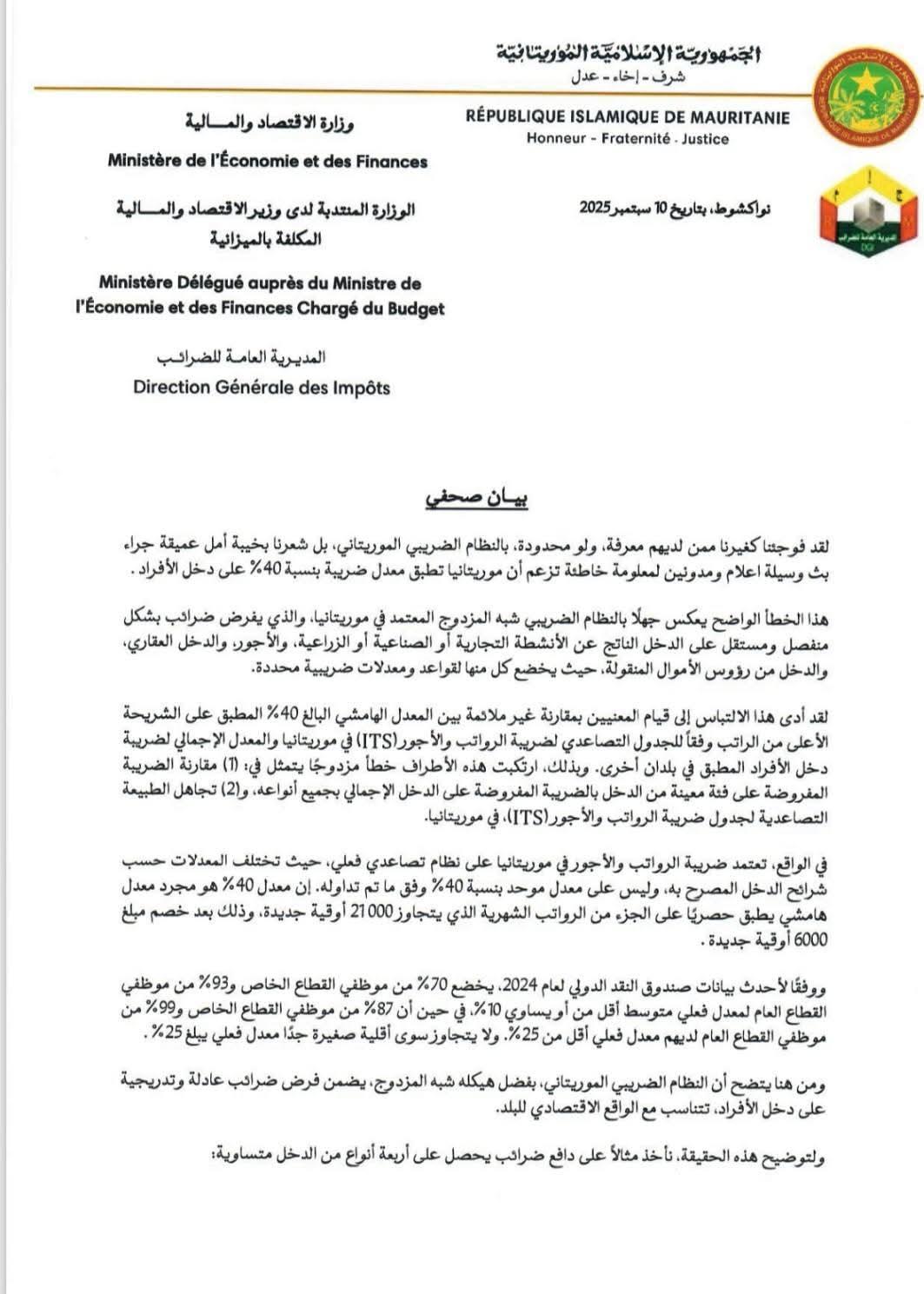 أكدت المديرية العامة للضرائب أن ما تم تداوله في بعض وسائل الإعلام وعلى منصات التواصل الاجتماعي بشأن فرض ضريبة موحدة بنسبة 40% على دخل الأفراد في موريتانيا غير صحيح، واعتبرت ذلك معلومة خاطئة تعكس سوء فهم للنظام الضريبي الوطني.