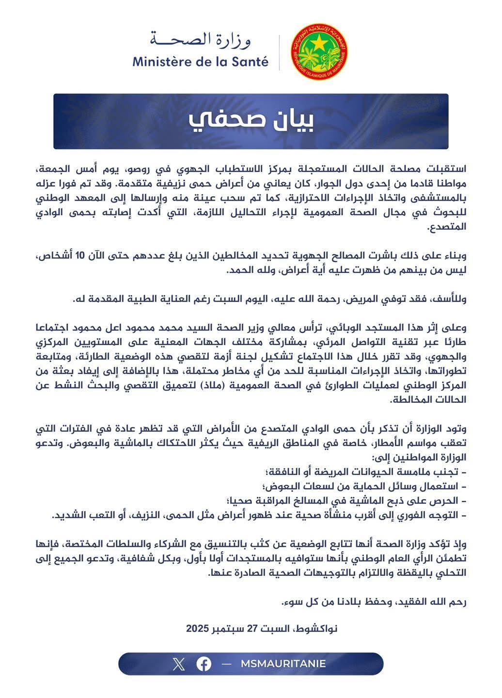 أعلنت وزارة الصحة الموريتانية، اليوم السبت 27 سبتمبر 2025، وفاة أول مصاب بحمى الوادي المتصدع في روصو بعد عزله وتلقيه الرعاية الطبية اللازمة. وأوضحت الوزارة أن المريض كان قد وصل يوم الجمعة من إحدى دول الجوار وهو في حالة متقدمة من المرض، حيث تأكدت إصابته بعد التحاليل المخبرية.