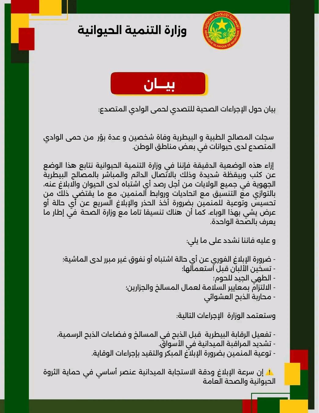 - ضرورة الإبلاغ الفوري عن أي حالة اشتباه أو نفوق غير مبرر لدى الماشية؛