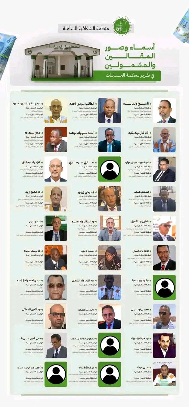 أحالت النيابة العامة في ولاية نواكشوط الغربية ملف تقرير محكمة الحسابات إلى شرطة الجرائم الاقتصادية، وكلفتها بالتحقيق مع المشمولين فيه. وتشمل اللائحة 30 شخصا، منهم 20 شخصا تمت إقالتهم من مناصبهم السامية، بما في ذلك 11 شخصا أنهى مجلس الوزراء مهامهم.