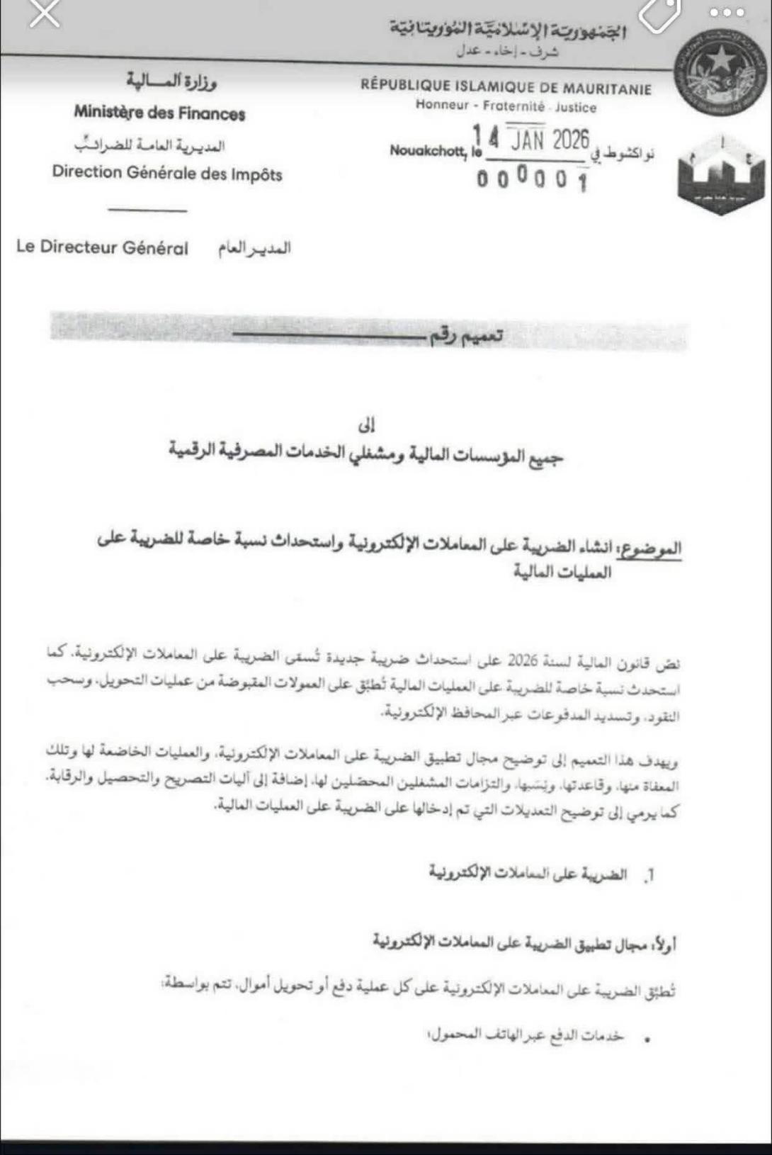 • ضريبة بنسبة 0.1% على المبالغ المحوّلة أو المسحوبة إلكترونيًا (ضمن المحافظ البنكية والتحويلات الرقمية).في مبالغ تفوق 5000 أوقية جديدة