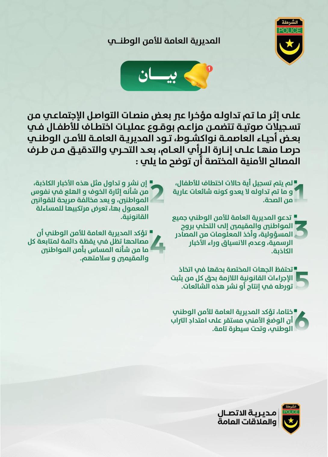 نفت المديرية العامة للأمن الوطني صحة ما تم تداوله عبر بعض منصات التواصل الاجتماعي بشأن وقوع عمليات اختطاف للأطفال في بعض أحياء العاصمة نواكشوط.