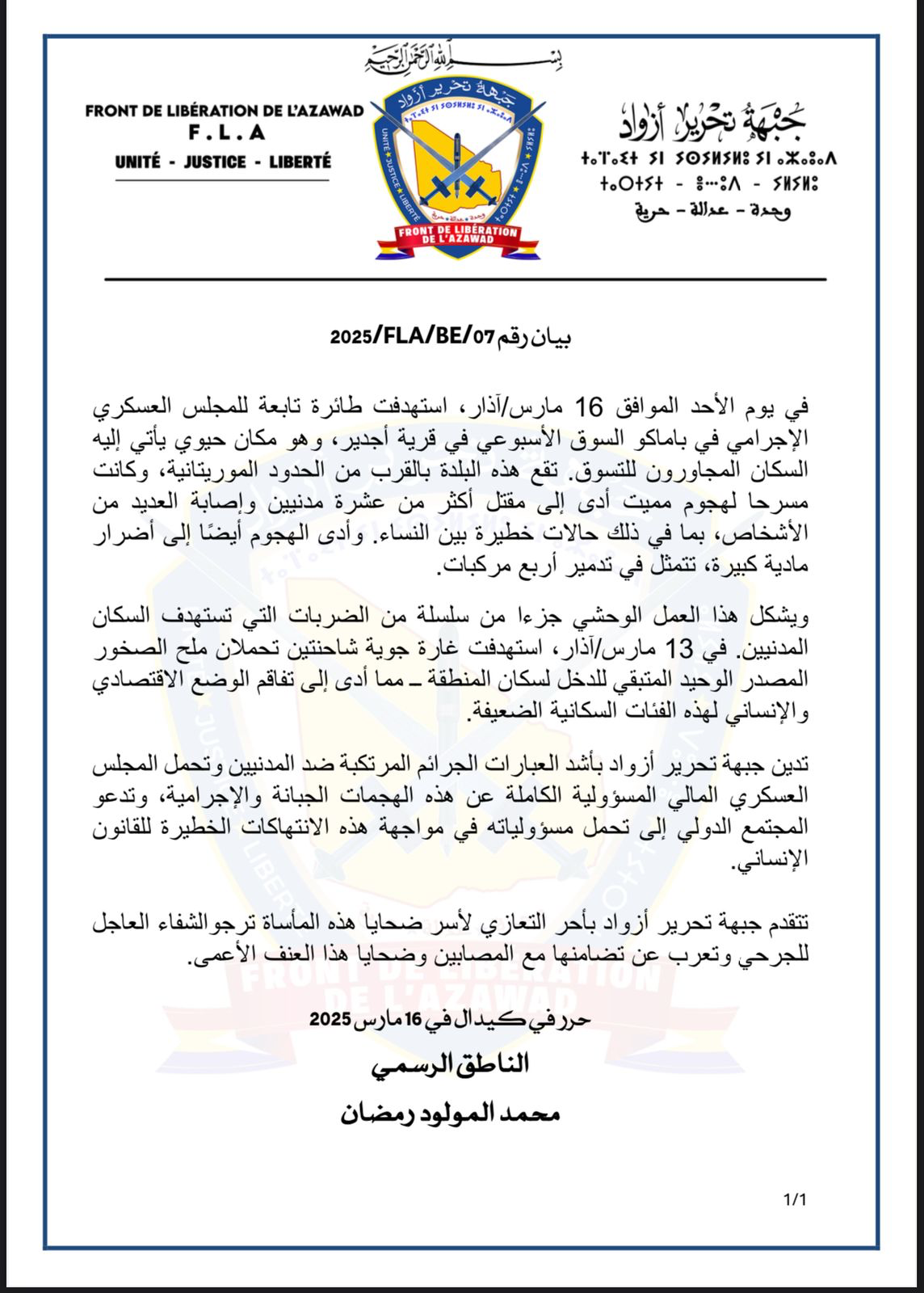 جبهة تحرير أزواد تدين هجوما على سوق أسبوعي قرب الحدود الموريتانية