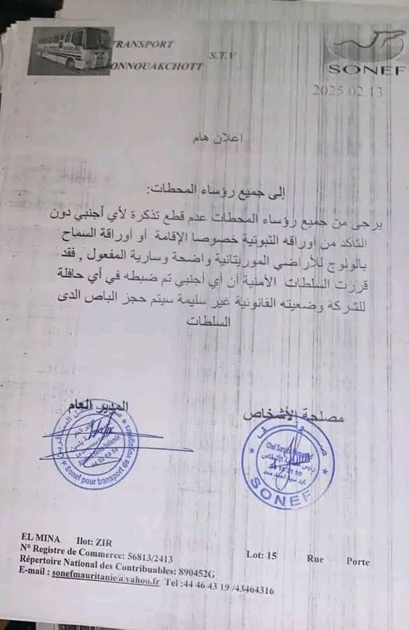 شركة SONEF للنقل تحذر من بيع التذاكر للأجانب دون وثائق إقامة سارية