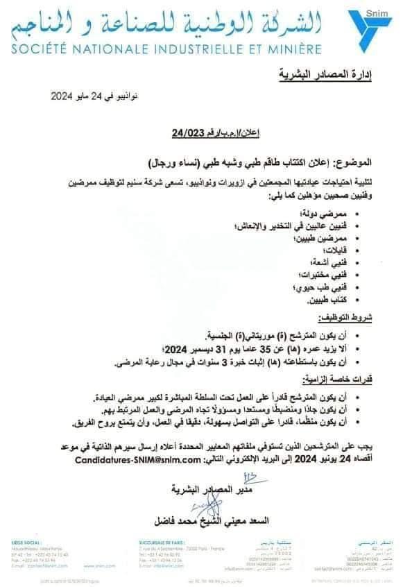 أعلنت الشركة الوطنية للصناعة والمناجم “اسنيم”عن فتح باب الاكتتاب لطاقم طبي وشبه طبي من الرجال والنساء.