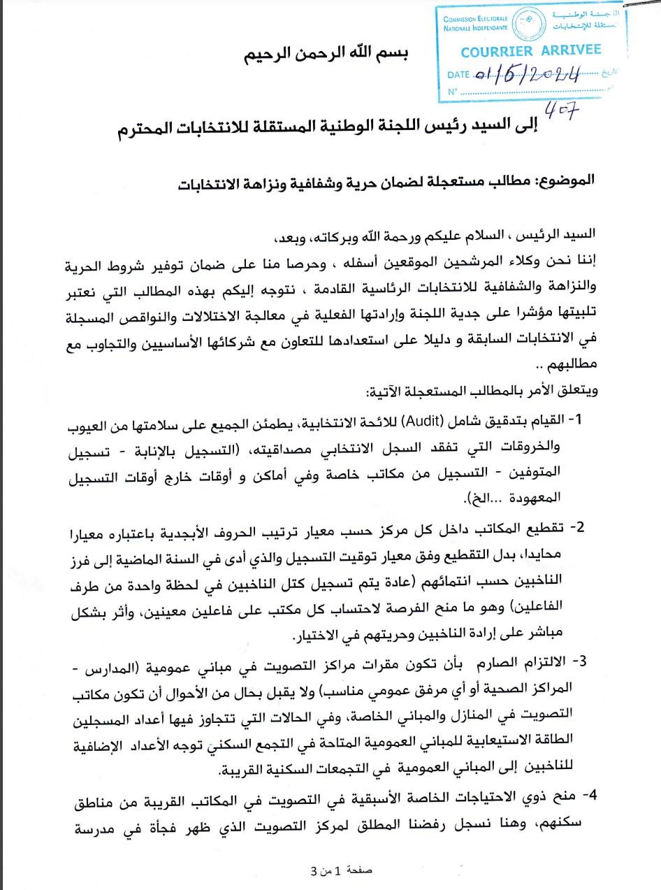 ومن بين المطالب المرسلة تدقيق شامل للائحة الانتخابية "يؤكد للجميع سلامتها من أي تجاوزات من قبيل (التسجيل بالإنابة، تسجيل المتوفين، التسجيل في مكاتب خاصة وفي أماكن وأوقات خارج أوقات التسجيل المعهودة" لضمان سير العملية الانتخابية بشفافية ونزاهة.