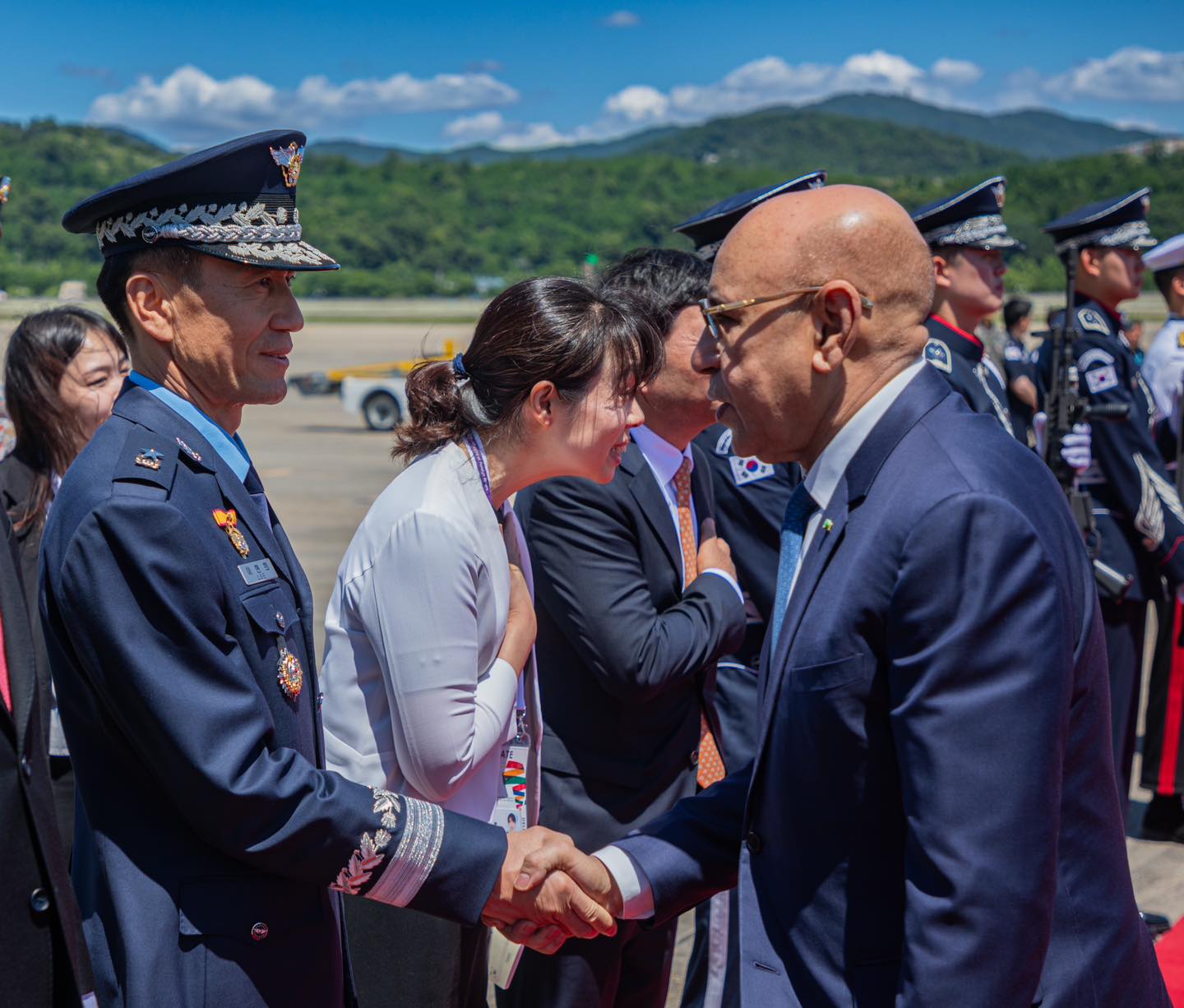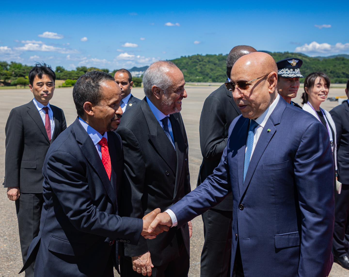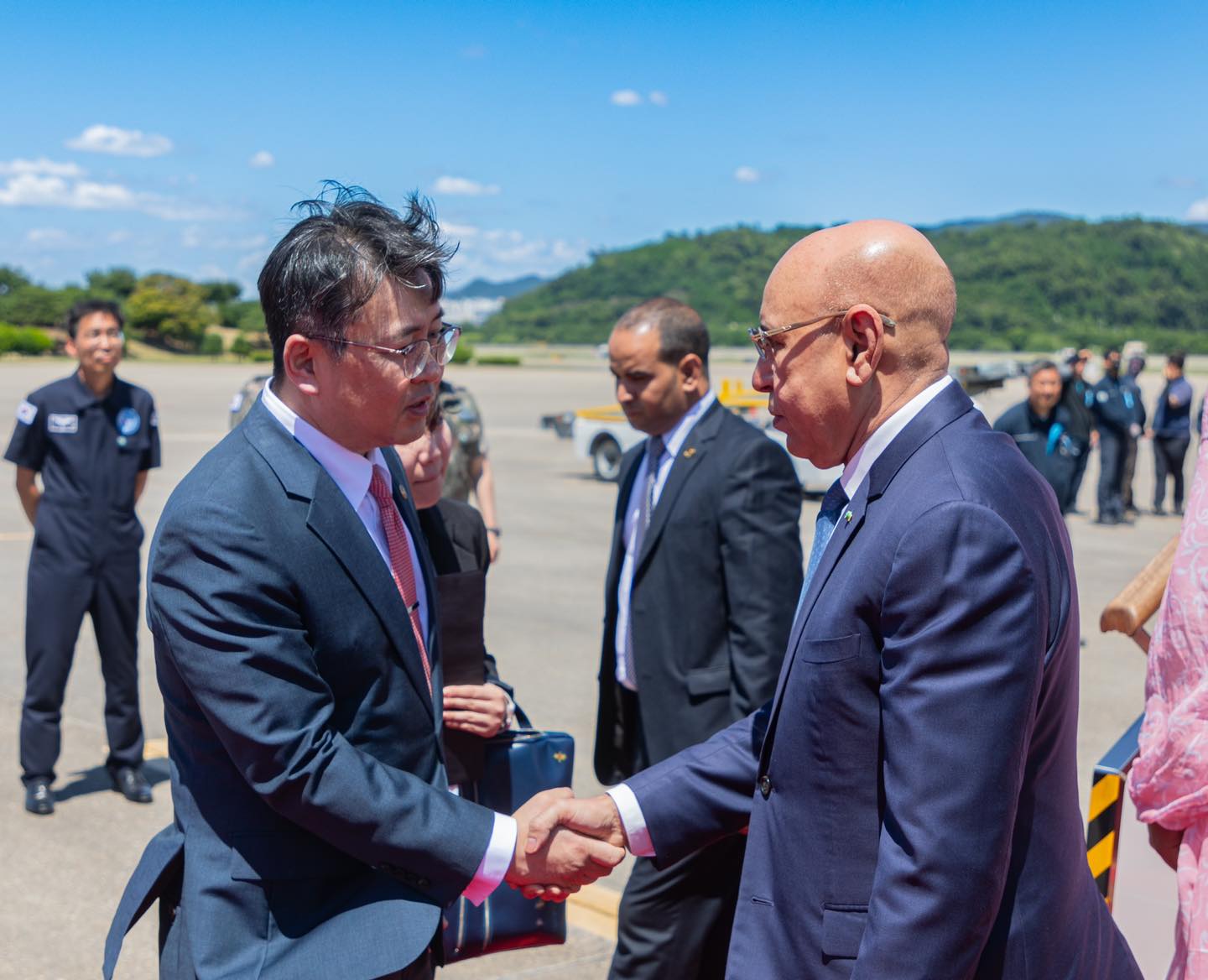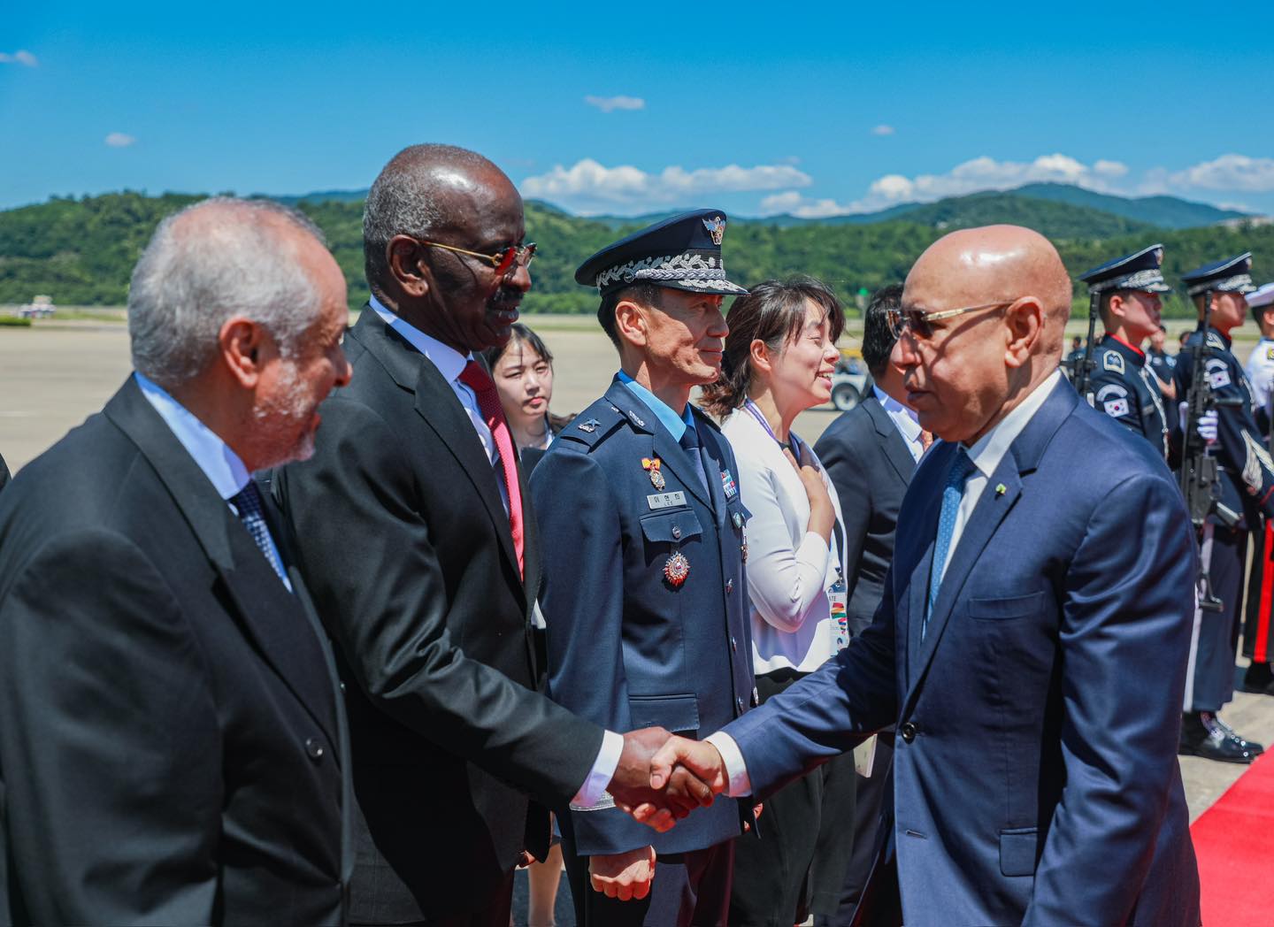 وكان في استقبال الرئيس بالمطار، أوه كي وونغ، وزير الشركات الصغيرة والمتوسطة والشركات الناشئة، والسيدة هيوون كيم، مديرة قسم التشريفات للشرق الأوسط، والسيد سيديا الحاج، سفير موريتانيا المعتمد لدى سيول؛ بالإضافة إلى السبد يونجان يون، سفير جمهورية كوريا لدى بلادنا.