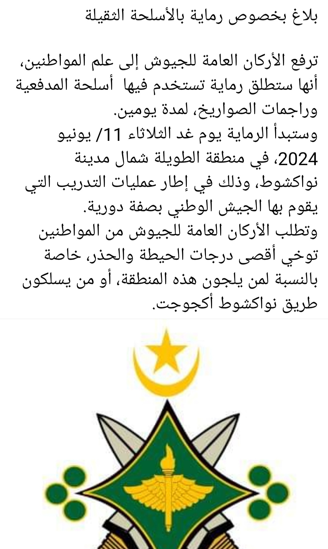 ودعت الأركان العامة للجيوش المواطنين إلى توخي أقصى درجات الحيطة والحذر، خصوصاً أولئك الذين يدخلون هذه المنطقة أو يسلكون طريق نواكشوط-أكجوجت، حرصاً على سلامتهم خلال فترة التدريبات.