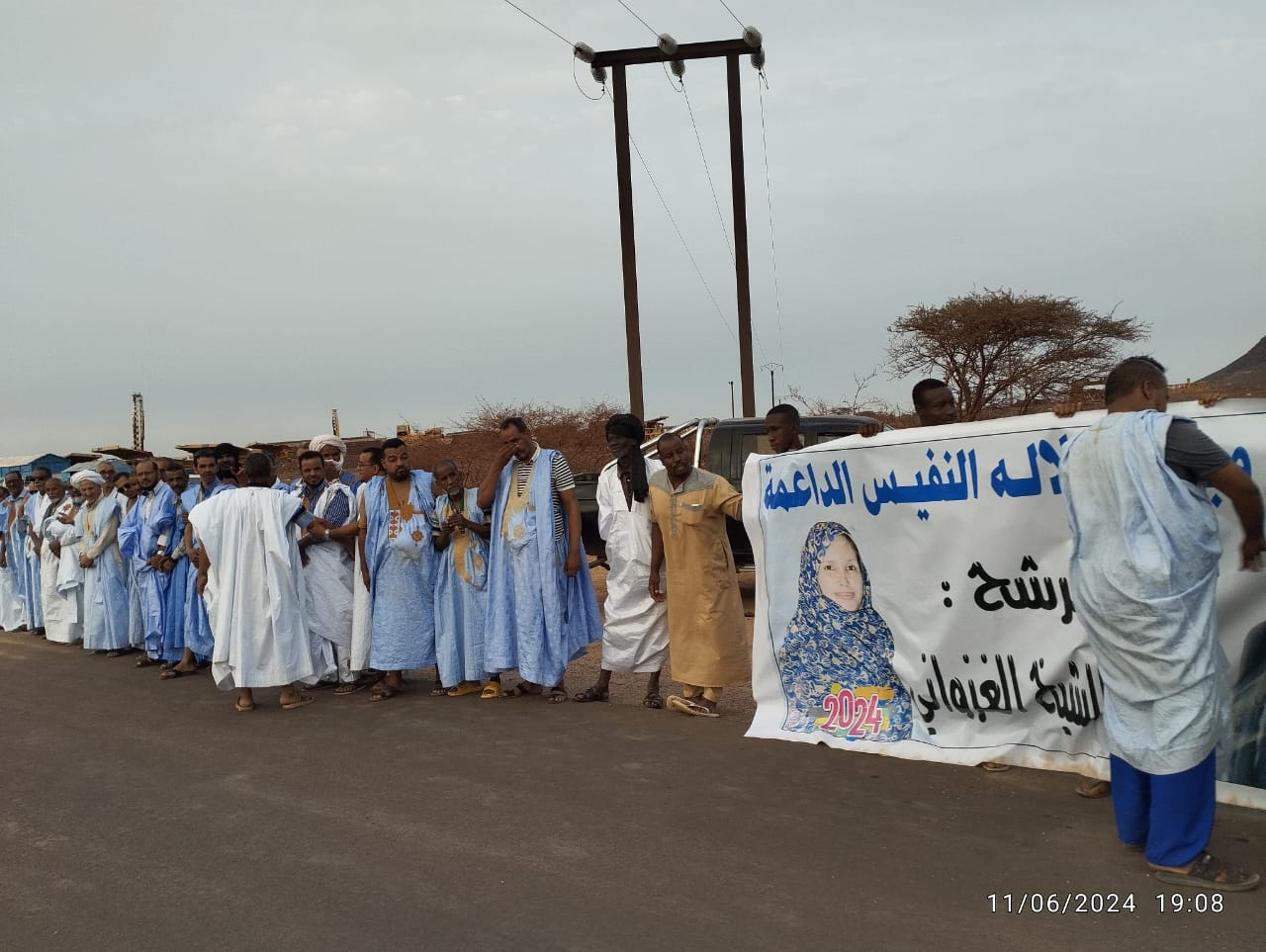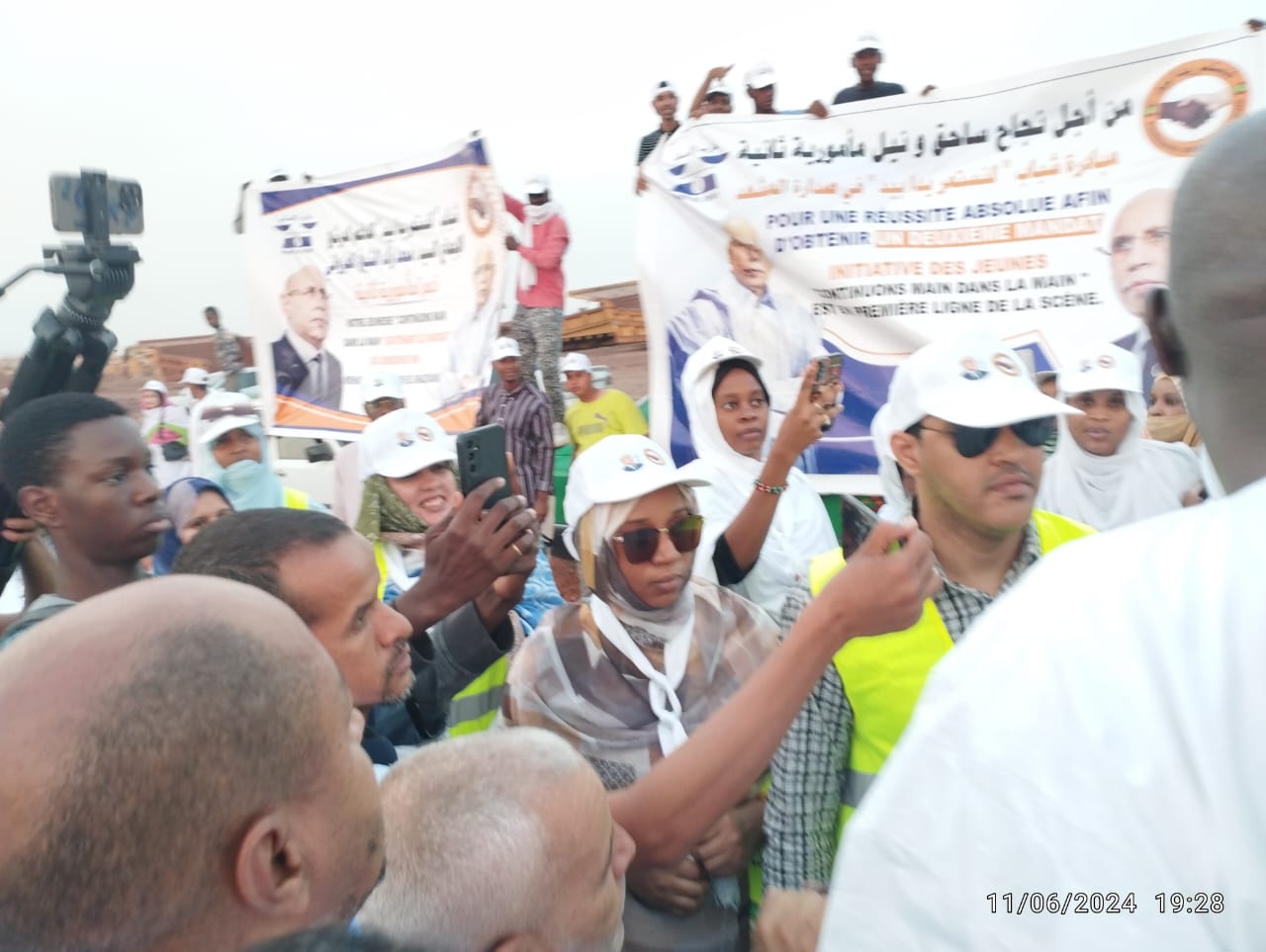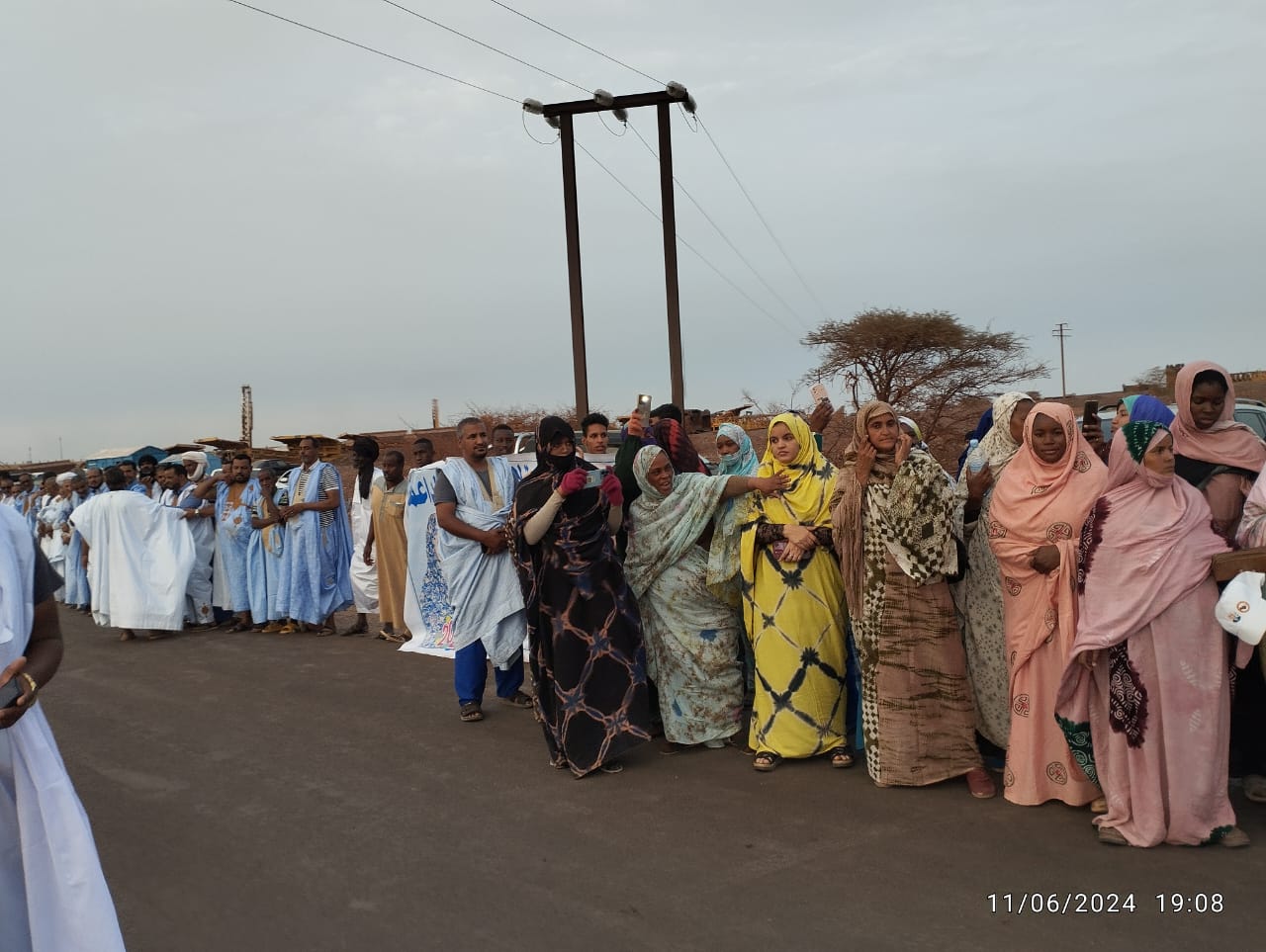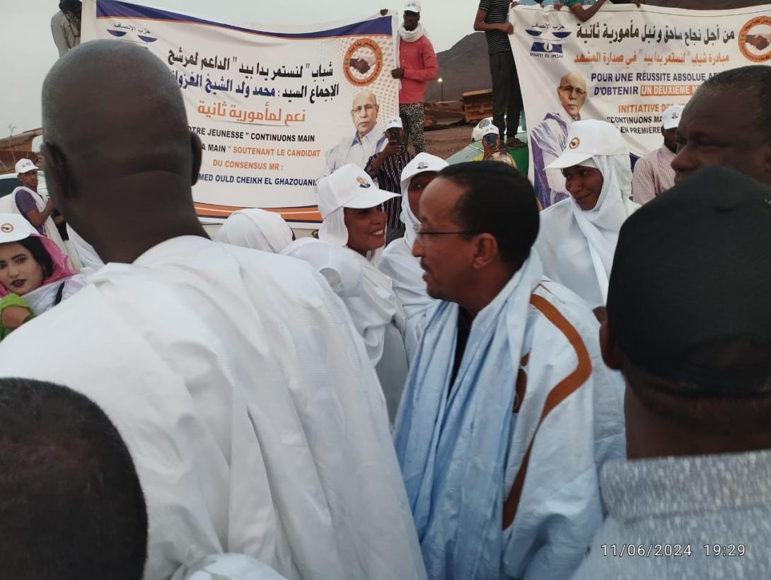 اصطفت جماهير عريضة على جانب الطريق عند مدخل المدينة معبرة عن دعمها للمرشح محمد ولد الغزواني معربة عن استعدادها تلبية مهمية المنسقين والعمل على انجاح مهمتهم والتصويت بكثرة يوم 29 يونيو لولد الغزواني .