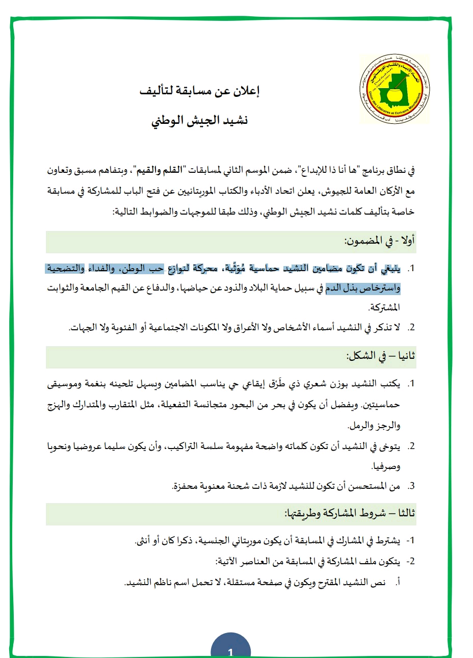 أعلنت الأركان العامة للجيوش عن تنظيم مسابقة لتأليف نشيد للجيش الوطني الموريتاني.