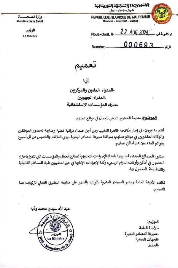 أصدرت وزارة الصحة الموريتانية اليوم الخميس، تعميمًا هامًا، إلى المدراء العامين والمركزيين، والمدراء الجهويين، ومدراء المؤسسات الاستشفائية. شددت فيه على ضرورة متابعة الحضور الفعلي للعمال في مواقع عملهم كجزء من جهود الوزارة لمكافحة ظاهرة التغيب عن العمل.