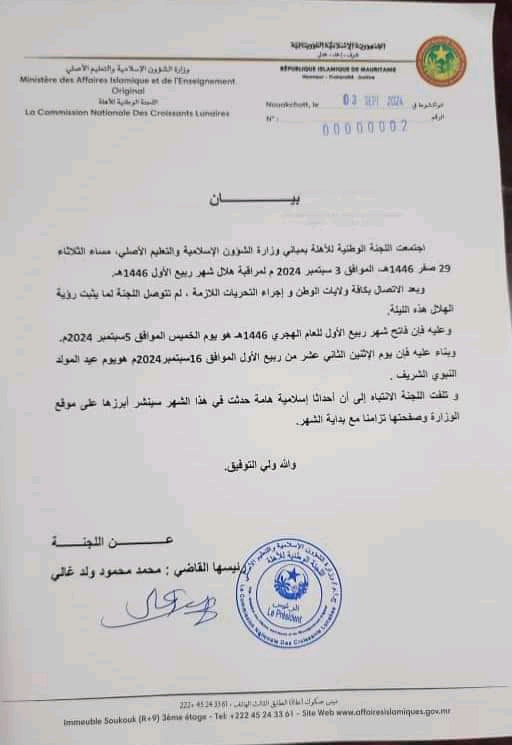 أعلنت اللجنة الوطنية لمراقبة الأهلة، في بيان صادر يوم الخميس 5 سبتمبر 2024، أن فاتح شهر ربيع الأول من العام الهجري 1446 سيكون يوم الجمعة 6 سبتمبر 2024.
