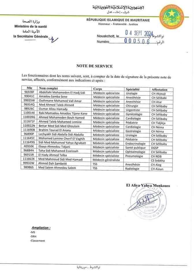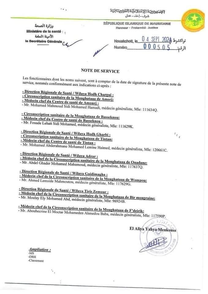 أعلنت وزارة الصحة عن إجراء تحويلات جديدة في بعض رؤساء الدوائر الصحية بالمقاطعات، كما تم تحويل بعض الاخصائيين إلى مستشفايات بعواصم ولايات الداخل .