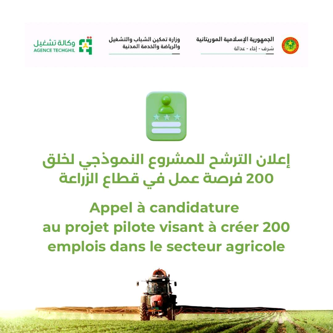 أعلنت وزارة تمكين الشباب والتشغيل والرياضة والخدمة المدنية، عبر الوكالة الوطنية للتشغيل (تشغيل)، عن فتح باب التسجيل للاستفادة من المشروع النموذجي لخلق 200 فرصة عمل في قطاع الزراعة، وذلك في إطار برنامج رئيس الجمهورية محمد ولد الشيخ الغزواني الهادف إلى تمكين الشباب وتوفير فرص العمل.