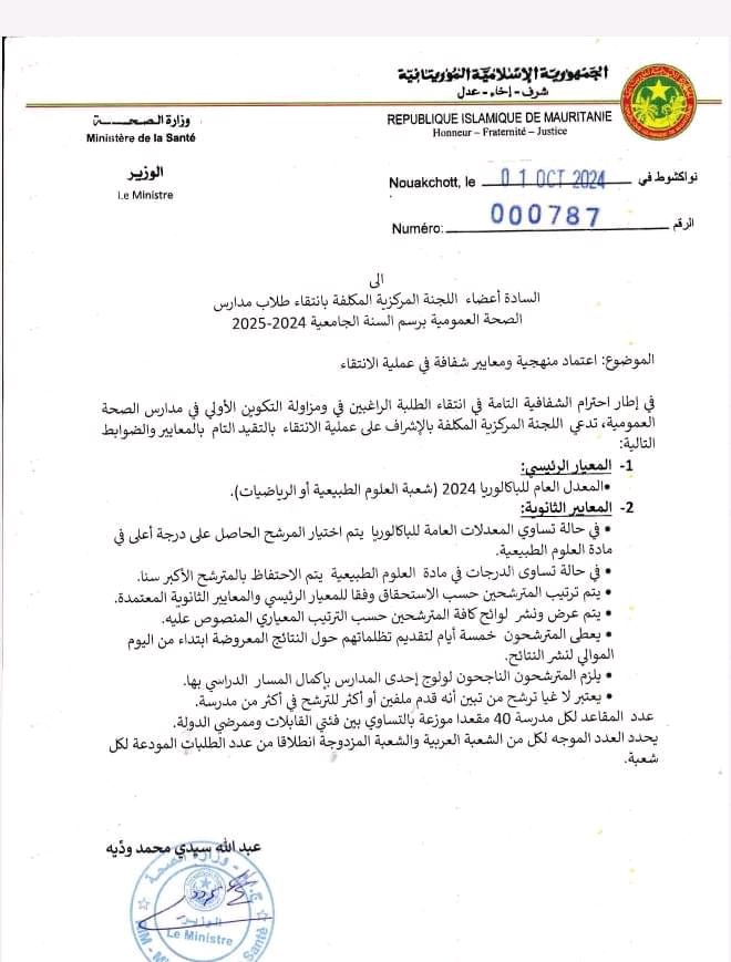 ألزم وزير الصحة عبد الله ولد وديه اللجنة المكلفة باختيار ملفات طلاب مدارس الصحة العمومية باعتماد معايير تضمن الشفافية في عملية الانتقاء.