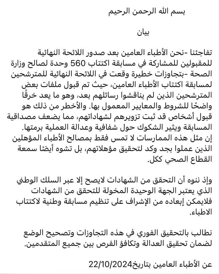 وفي بيان صدر عن المجموعة، أكد الأطباء أن هذه التجاوزات «تضعف مصداقية المسابقة وتثير الشكوك حول شفافيتها وعدالتها»، معتبرين ذلك «خرقاً واضحاً للشروط والمعايير المعمول بها».