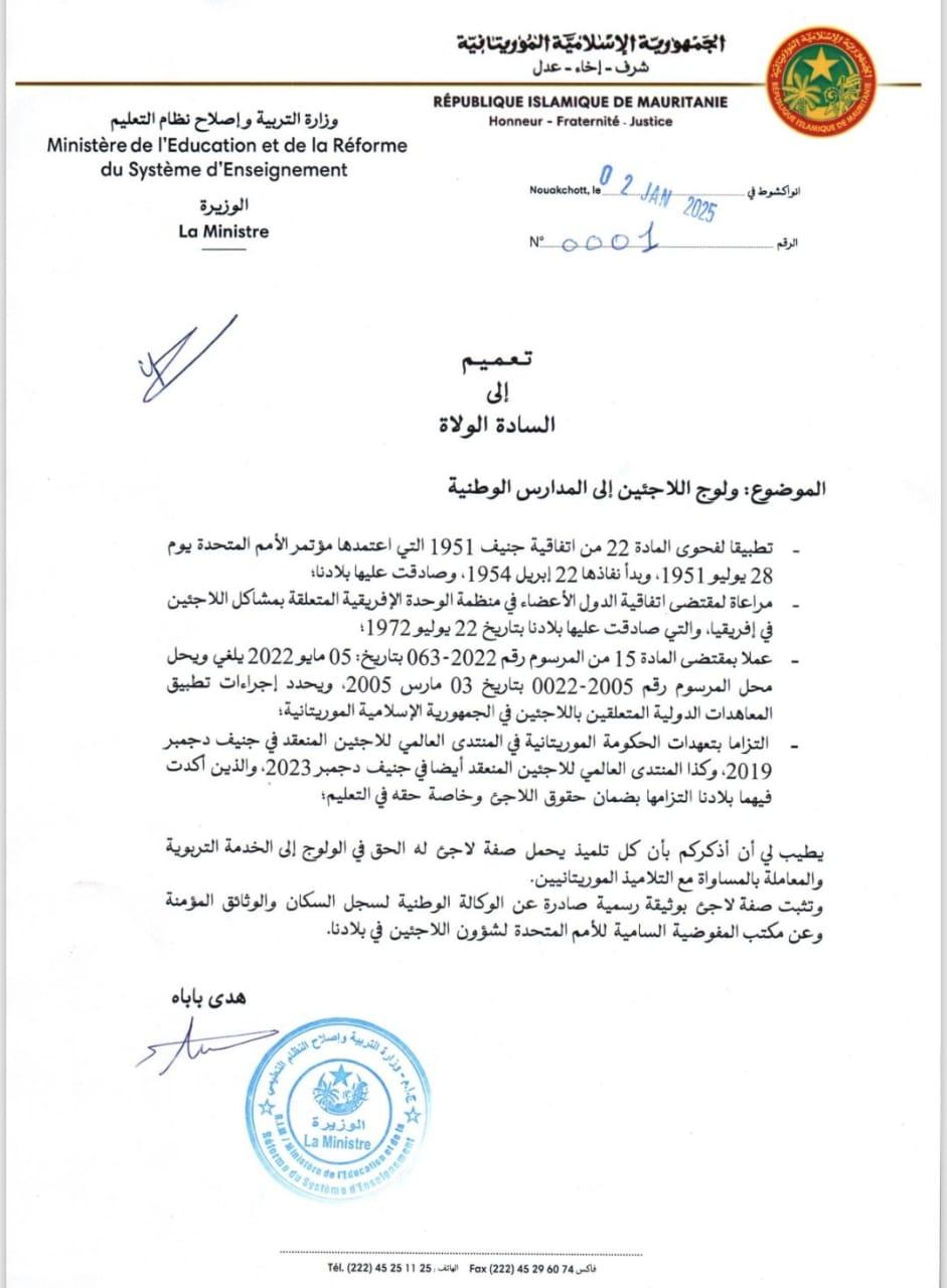 أعلنت وزارة التهذيب الوطني وإصلاح النظام التعليمي أن التلاميذ الحاصلين على صفة لاجئ يتمتعون بحق الاستفادة من الخدمات التعليمية على قدم المساواة مع التلاميذ الموريتانيين.