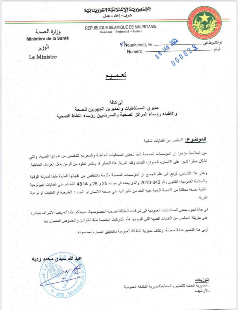 صرّح وزير الصحة، عبد الله سيدي محمد وديه، بأن بعض المؤسسات الصحية تتبع أساليب خاطئة وخطيرة للتخلص من نفاياتها الطبية، مما يهدد صحة الإنسان والبيئة.