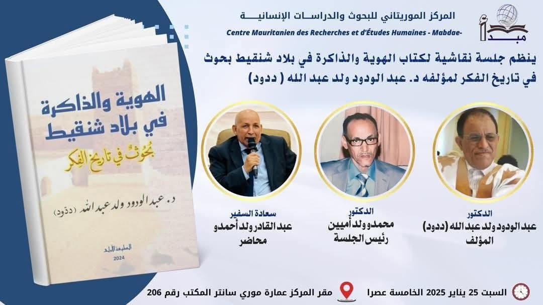 نظم المركز الموريتاني للبحوث والدراسات الإنسانية “مبدأ”، مساء السبت 25 يناير 2025، جلسة نقاشية حول كتاب “الهوية والذاكرة في بلاد شنقيط: بحوث في التاريخ والفكر”، وذلك بفندق “موريصانتر” في نواكشوط.
