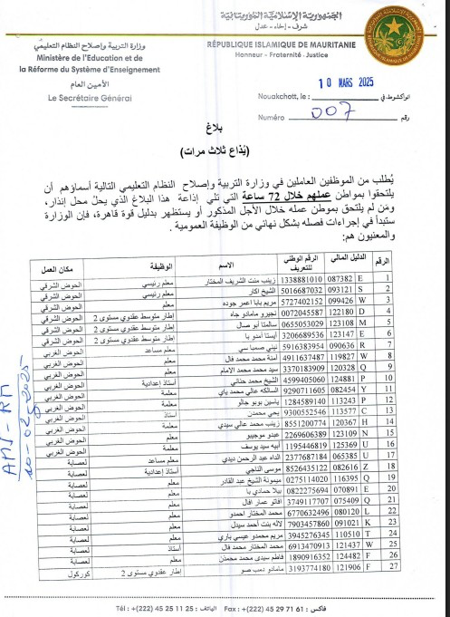 وجّهت وزارة التربية وإصلاح النظام التعليمي إنذارًا لـ64 مدرسًا بسبب عدم التزامهم بالحضور إلى أماكن عملهم، مؤكدة أنه في حال عدم التحاقهم خلال 72 ساعة، أو تقديم مبرر قانوني مقبول، فسيتم الشروع في إجراءات فصلهم نهائيًا من الوظيفة العمومية.