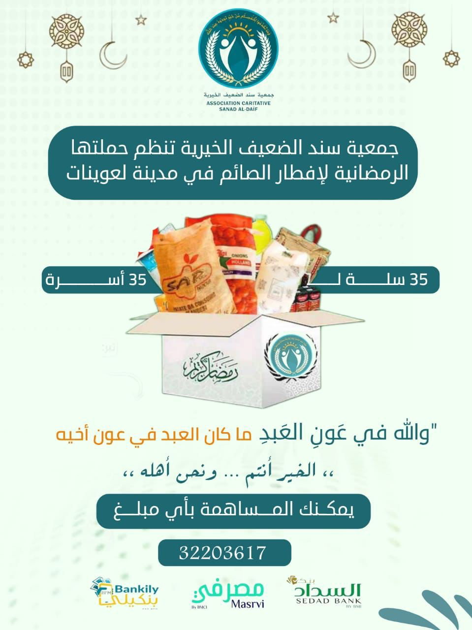 أطلقت جمعية سند الضعيف الخيرية، اليوم السبت 15 مارس 2025، حملتها السنوية لإفطار الصائمين، في مبادرة إنسانية تهدف إلى مساندة الأسر المتعففة خلال شهر رمضان المبارك. وقد أشرفت على انطلاق الحملة مسؤولة النشاطات مغلاهَ طالبنَ، وسط حضور عدد من أعضاء الجمعية.