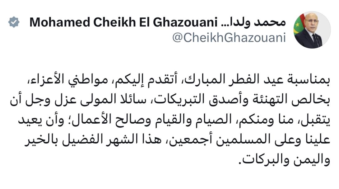 وجه الرئيس الموريتاني محمد ولد الغزواني تهنئة إلى المواطنين بمناسبة عيد الفطر المبارك عبر تغريدة نشرها على حسابه بمنصة إكس تويتر سابقا معربا عن خالص التبريكات وصادق التمنيات داعيا الله أن يتقبل منهم صيامهم وقيامهم وسائر أعمالهم الصالحة وأن يعيد هذا الشهر الفضيل على الجميع بالخير والبركات