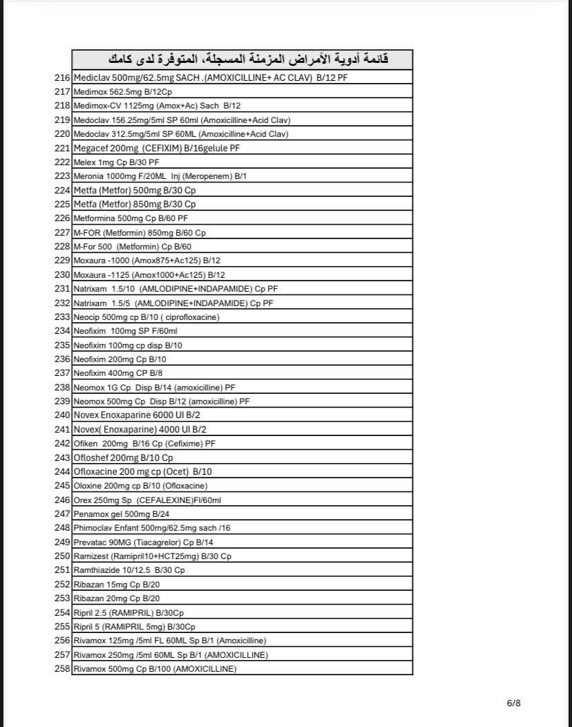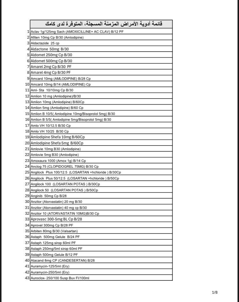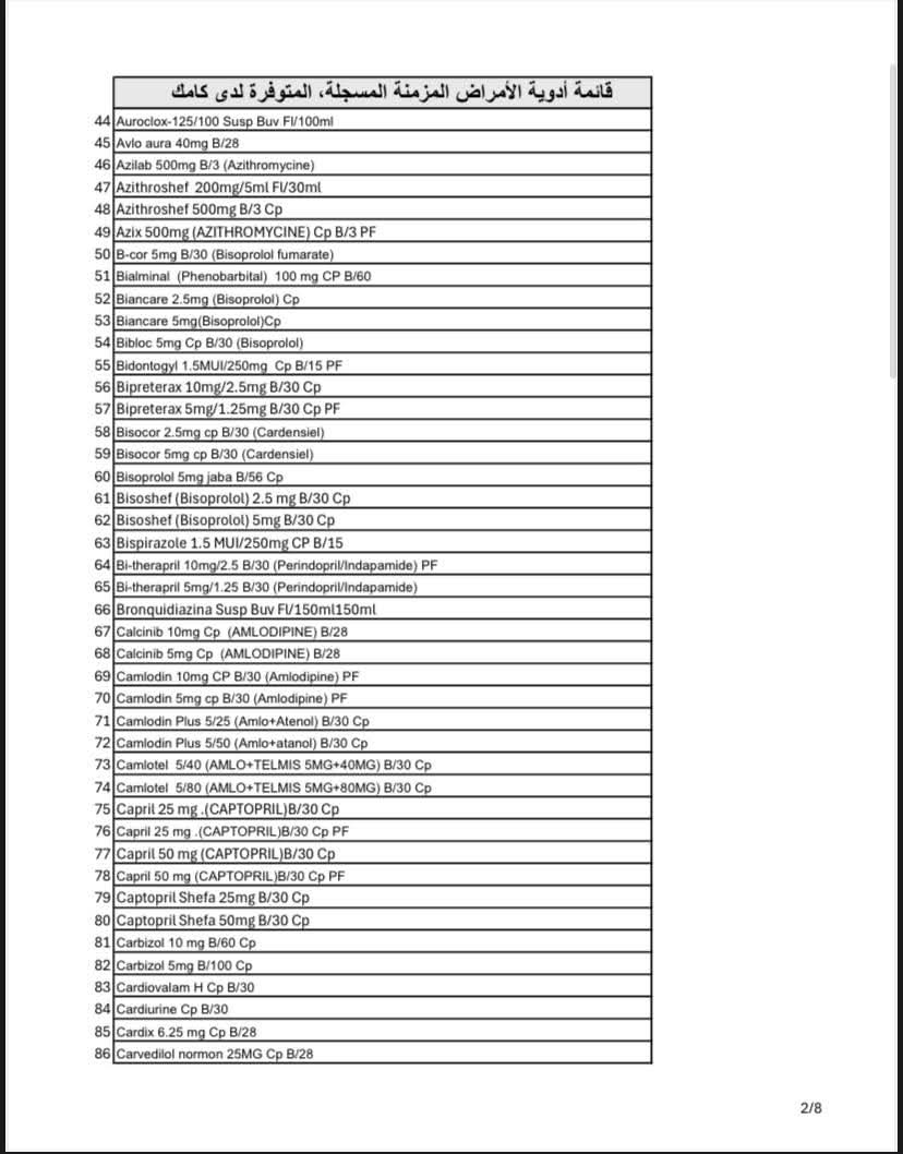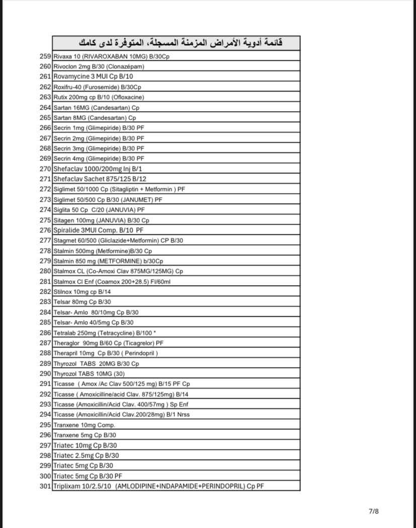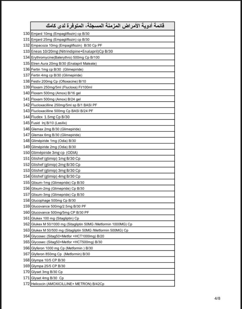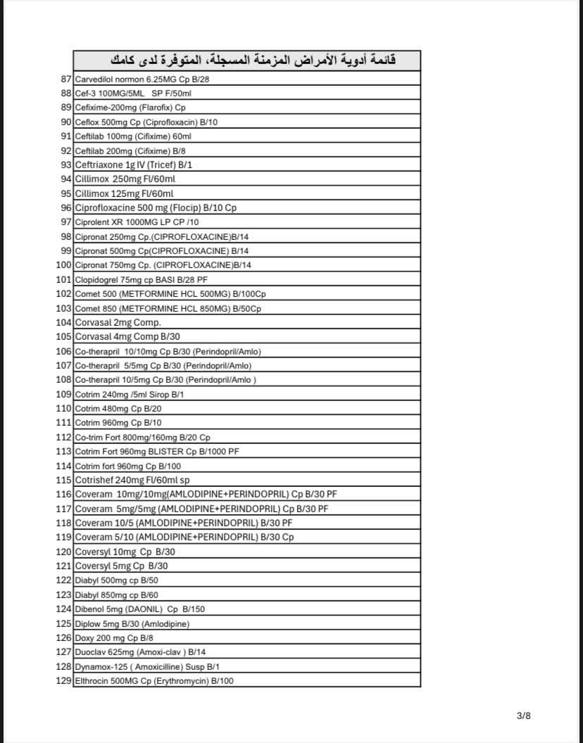 وأوضحت "كامك" أن عدد الأصناف المتوفرة يتجاوز 320 صنفًا دوائيًا مسجلاً، تشمل علاجات أساسية لأمراض مثل السكري، والضغط، والقلب، ومضادات التخثر.