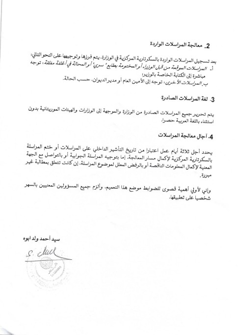 أصدر وزير الاقتصاد والمالية، السيد سيد أحمد ولد أبوه، تعميما جديدا يقضي باعتماد اللغة العربية حصرا في جميع المراسلات الصادرة عن الوزارة والموجهة إلى الوزارات والمؤسسات الوطنية، دون استثناء.