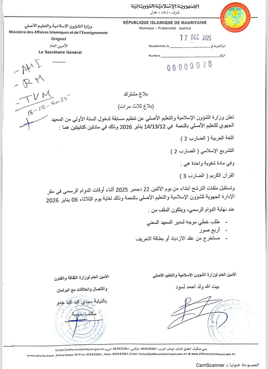 أعلنت وزارة الشؤون الإسلامية والتعليم الأصلي عن تنظيم مسابقة لطلاب السنة الأولى بالمعهد الجهوي للتعليم الأصلي بمدينة النعمة، وذلك أيام 12 و13 و14 يناير 2026.