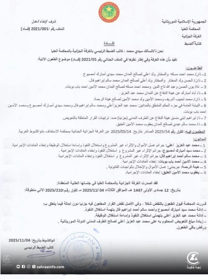 كما صادقت المحكمة على العقوبات الصادرة بحق كل من ولد امصبوع وولد بوبات، لتطوي بذلك آخر مراحل التقاضي في ملف "العشرية".