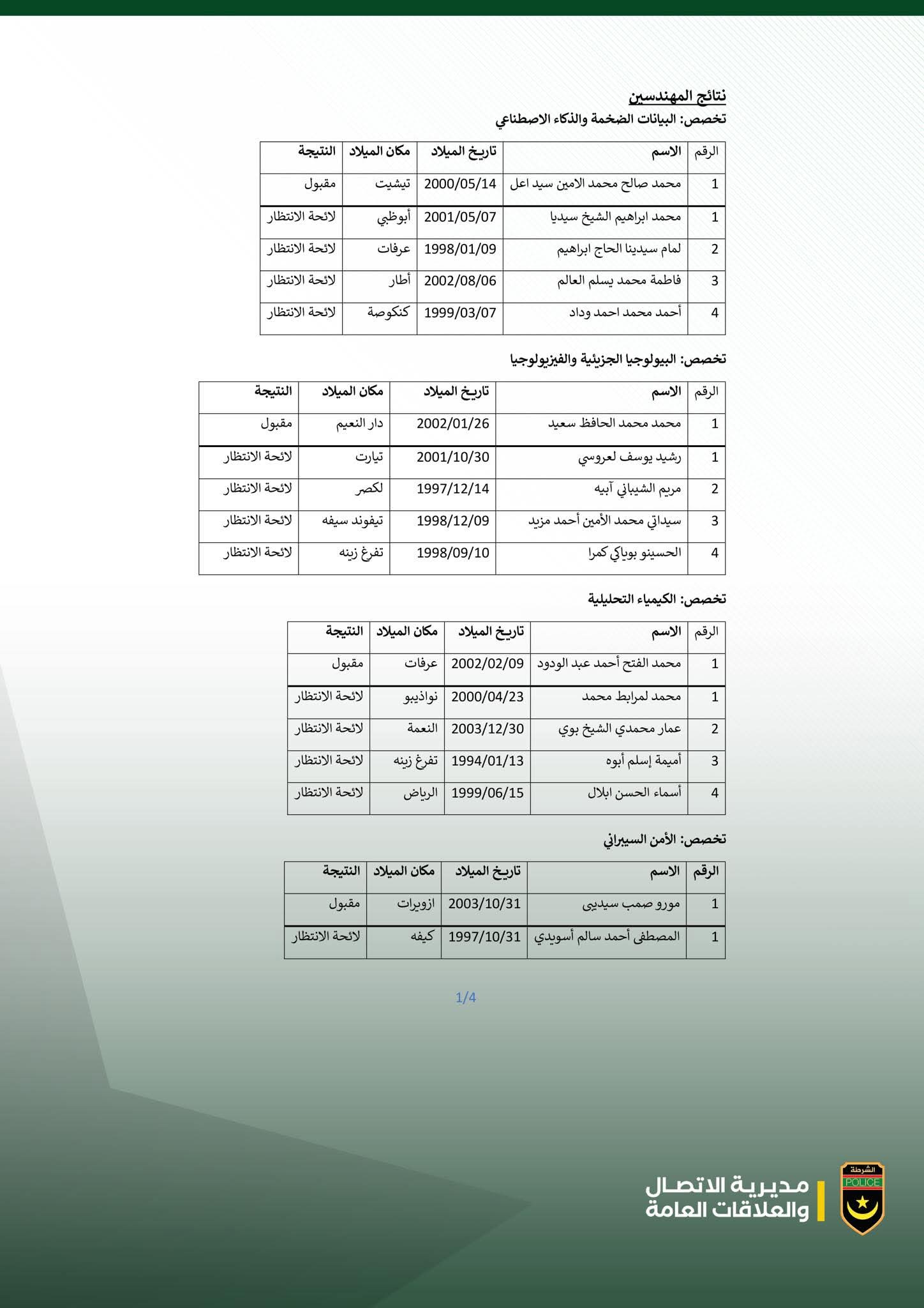 وبحسب اللوائح المرفقة، فقد تم قبول مترشحين في عدد من التخصصات، من بينها البيانات الضخمة والذكاء الاصطناعي، والبيولوجيا الجزيئية والفيزيولوجيا، والكيمياء التحليلية، والأمن السيبراني، في حين تم إدراج بقية المترشحين ضمن لوائح الانتظار. ودعت المديرية المعنيين إلى الاطلاع على القوائم المنشورة لمزيد من التفاصيل.